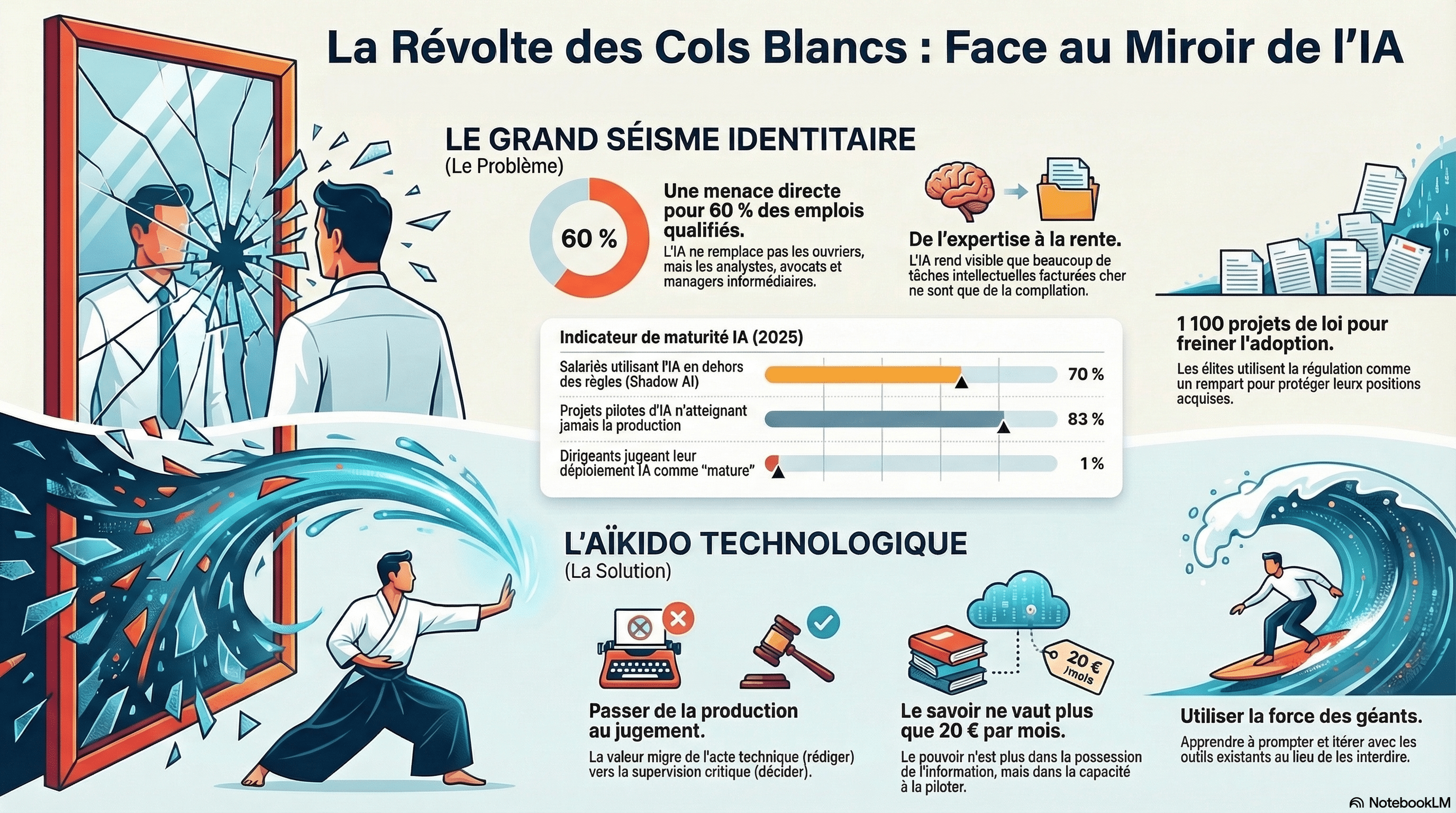 Cette stratégie vaut pour les nations comme pour les individus. Le col blanc qui utilise ChatGPT, Claude ou Gemini aujourd’hui pour comprendre comment l’IA transforme son métier ne capitule pas. Il se prépare. Il accumule un avantage que ceux qui refusent d’y toucher n’auront jamais. Il sera prêt pour la prochaine disruption. Pas parce qu’il aura résisté. Parce qu’il aura appris.