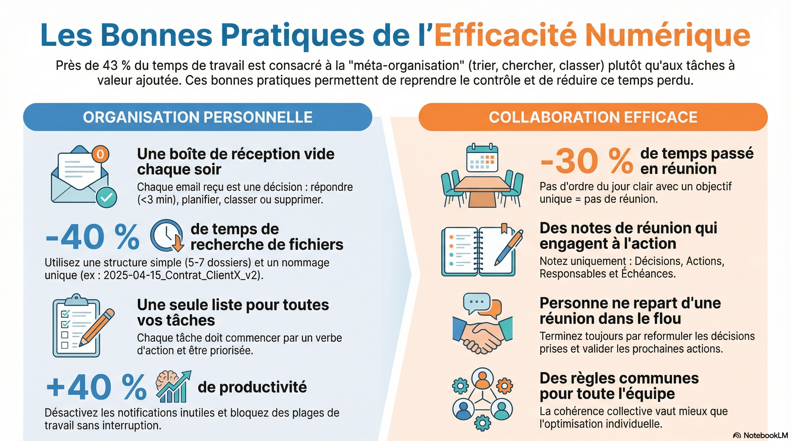La vraie rupture productive ne vient pas d’un nouvel outil, mais de décisions simples et partagées. Clarifier ce qui mérite un email et ce qui n’en mérite pas. Définir des règles de nommage compréhensibles par tous. Limiter volontairement les canaux. Assumer qu’une information mal trouvable est une information perdue. Accepter aussi que finir sa journée avec une boîte mail à zéro n’est pas un luxe, mais une condition de continuité du travail.