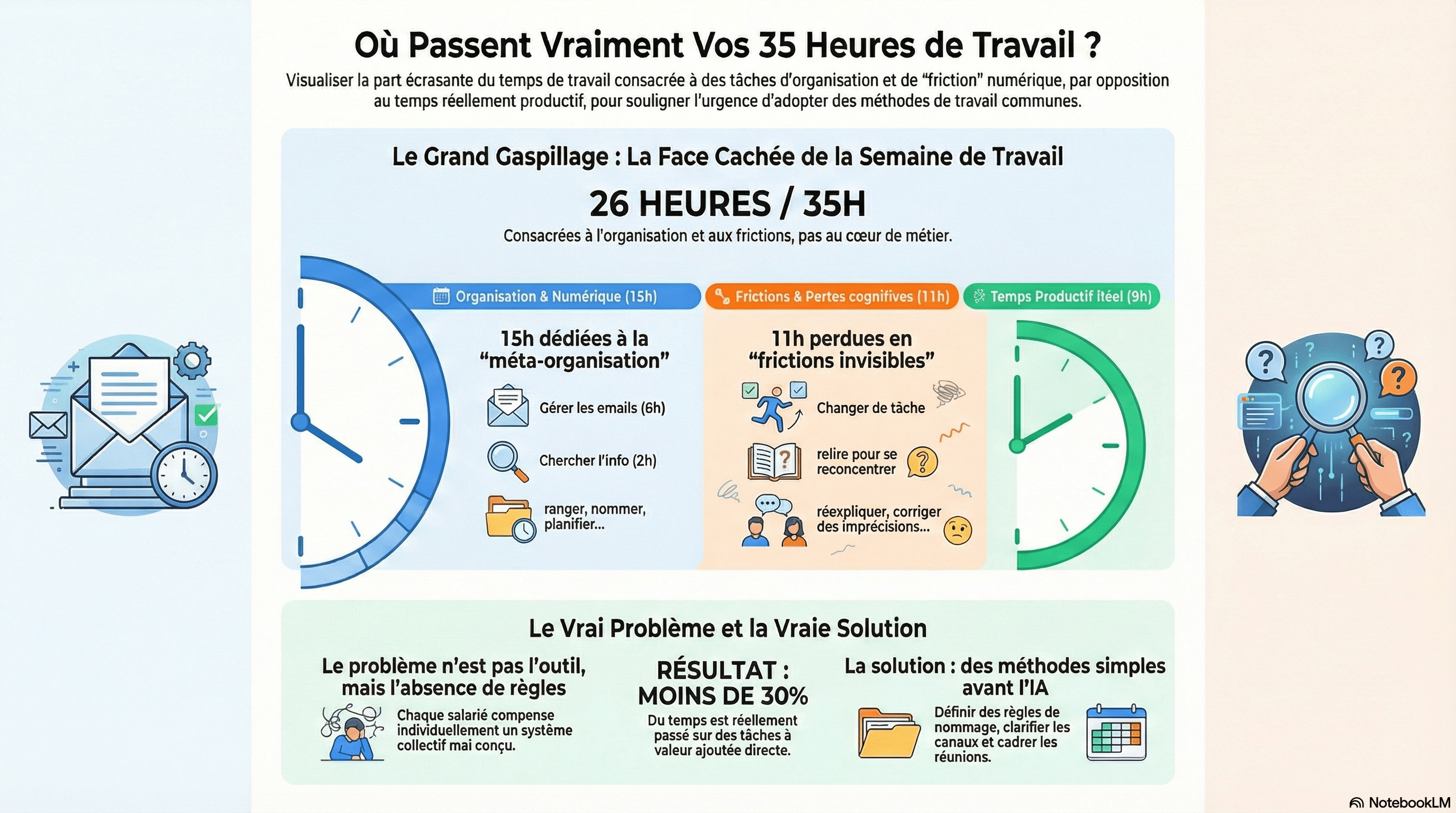 Dans une semaine de 35 heures, un salarié du tertiaire consacre souvent entre 12 et 15 heures à des tâches d’organisation numérique : lire et trier des emails, chercher une information déjà produite, nommer ou retrouver des fichiers, préparer ou subir des réunions mal cadrées, reprendre une tâche interrompue, nettoyer en fin de journée ce qui n’a pas été traité. Ce temps n’est ni visible ni reconnu, car il est diffus, morcelé, et rarement formalisé dans les fiches de poste. Pourtant, il structure profondément l’expérience de travail.